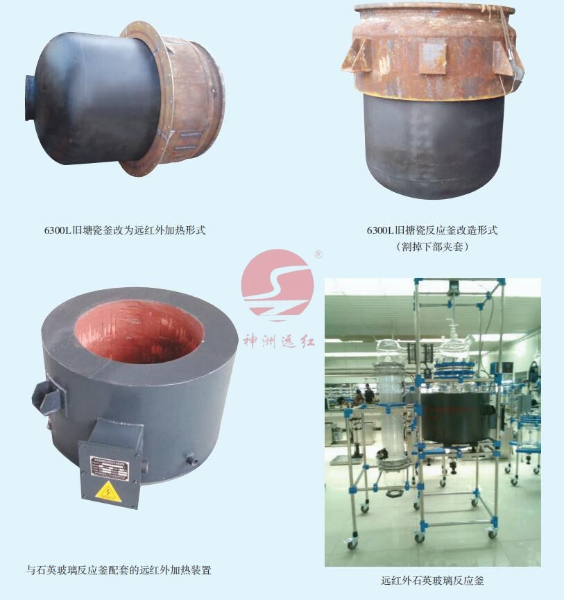T/GF-M型搪瓷釜用遠紅外加熱系列主要對”搪瓷反應釜”加熱,該加熱形式配備了降風管,針對反應釜膽內(nèi)無法安裝蛇管降溫時而專門設計的加熱結構形式,在加熱裝置外部上、下各安裝一對進出風口,通過鼓風機將室外空氣抽進到加熱裝置內(nèi),再通過出風口將加熱裝置內(nèi)部熱量排到室外去,可根據(jù)物料所需的降溫速度配套相應功率的鼓風機和風管口徑,其降溫形式既起到降溫效果,同時又起到防止過熱保護搪瓷的作用,鼓風機開關可與溫控柜連鎖控制